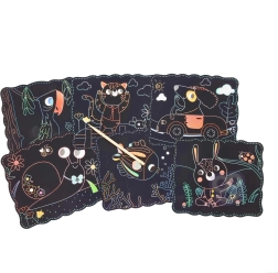I pakken finder du 6 skrabekort med dyr – kat, hund, snegl, kanin, fisk og papegøje – samt en træstylus. Takket være den praktiske emballage med lukning er sættet nemt at tage med i bilen, på restaurant eller på ferie. Aktiviteten understøtter finmotorik, tålmodighed og skaberglæde.