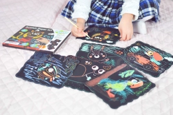 Seks forskellige kort med kat, hund, snegl, kanin, fisk og papegøje motiverer børn til at skabe og opdage skjulte farver.