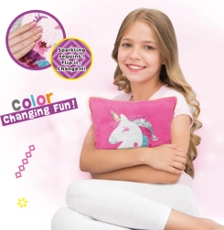 Det kreative sæt Woopie ART&FUN giver børn sjov syning og dekoration af en pude med enhjørninge-motiv. I pakken finder du alt, hvad du behøver – betræk, pude, pailletter, nål og tråd. Den færdige pude har en magisk effekt: ved berøring skifter den farve. Et fantastisk valg til at udvikle kreativitet, fantasi og finmotorik allerede fra 5 år.