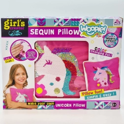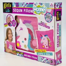 Oplev en verden af mode og kreativitet med det kreative sæt Woopie ART&FUN. Enkel syning, som selv begyndere kan klare – der skal blot lidt forestillingsevne og tålmodighed til. Takket være de vendbare pailletter vil din enhjørninge-pude skinne og ved et strøg med hånden magisk skifte farve. Materialerne er behagelige at røre ved og uden skarpe kanter.