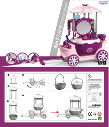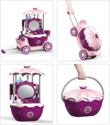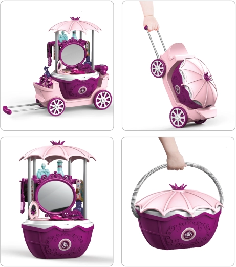 Dette pink-lilla toiletbord til børn foldes nemt sammen til en praktisk kuffert med udtrækkeligt håndtag og hjul – ideelt til både hjemmet og på farten. Børn kan åbne deres eget bærbare makeupsalon-studie, børste hår, lægge makeup og tage sig af “kunder” efter egen fantasi.