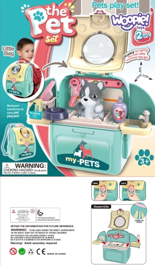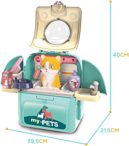 Oplev det kompakte 2-i-1 sæt – en sød rygsæk/transportkasse med kiggevindue og en komplet mini kæledyrspleje-salon indeni. Børn kan bade katten i vasken med vandhane, rede, klippe og derefter fodre den fra skålene. Låselige døre og aftagelig skulderrem sikrer komfortabel og sikker bæring.