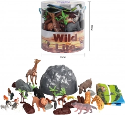 - Dyrefigurer, tilbehør (træer, sten), tematisk safari-kort, opbevaringsspand