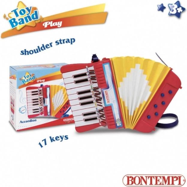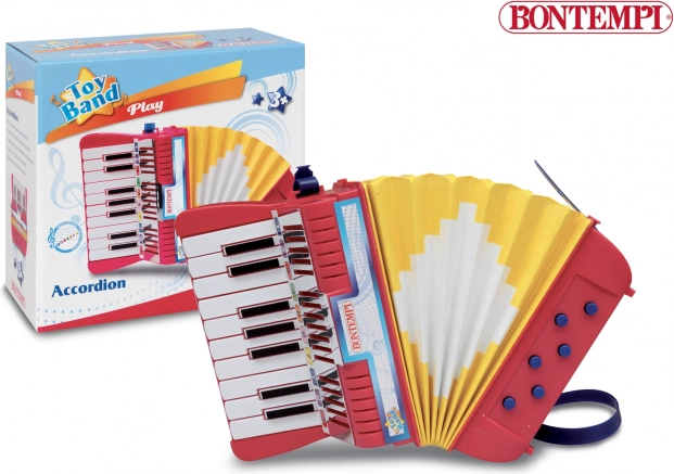 BONTEMPI børne-accordeon er et ideelt første musikinstrument til små musikere. Takket være det kompakte design, den robuste udførelse og den intuitive betjening kan børn let tilegne sig grundlæggende spilleteknik og rytme. Remme af slidstærk plast sikrer stabilt greb og tryghed under spil.