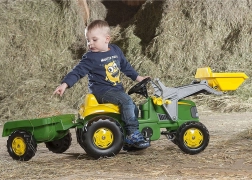 Børnenes trædetraktor JOHN DEERE RollyKid med løftbar frontskovl og aftagelig trailer giver timevis af aktiv leg i haven og på legepladsen. Den robuste konstruktion, et indbygget mekanisk system for øget sikkerhed, åbneligt motorhjelm med opbevaringsrum og kædetræk for jævn kørsel gør denne traktor til et fremragende valg for børn fra 3 år.