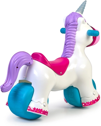 Den interaktive FEBER-enhjørning vokser med dit barn: på et øjeblik kan du ændre den fra gynge til gåbil. Den brede base og de store hjul giver sikkerhed og stabilitet, det ergonomiske sæde og håndtag ligger godt i hånden og støtter en naturlig kropsholdning. Perfekt til leg både inde og ude.