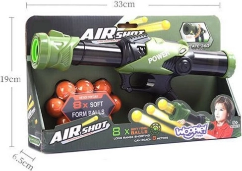 Sjovt og sikkert legetøj til børn: den automatiske skumpistol WOOPIE skyder bløde bolde op til 8 meter. Let at bruge – blot læg boldene i løbet og pump. Kræver ingen batterier eller kompliceret montering, den er let, bærbar og ideel til leg både inde og i haven.
