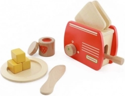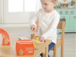 Træbrødristeren fra Masterkidz er et ideelt valg til børn, der kan lide at lege hus. Den er lavet af højkvalitets naturtræ, som er sikkert for børn. Brødristeren er udstyret med en funktionel arm, der simulerer toast, der popper op, samt en drejeknap, hvilket giver en realistisk legeoplevelse.