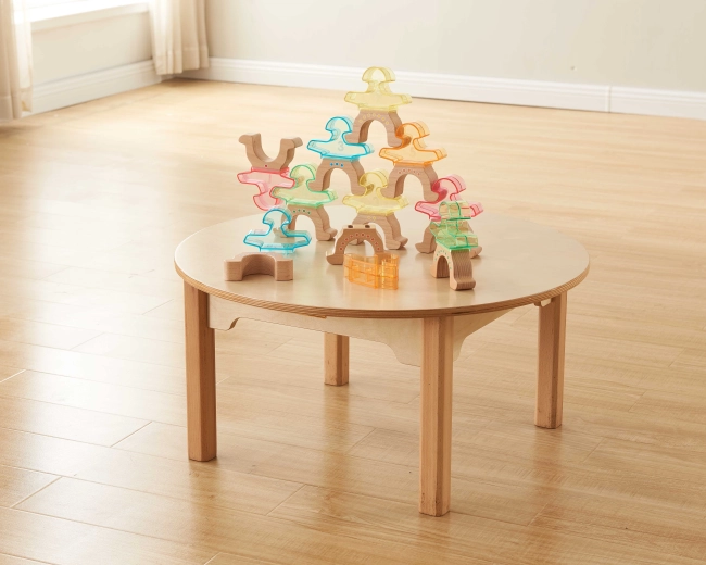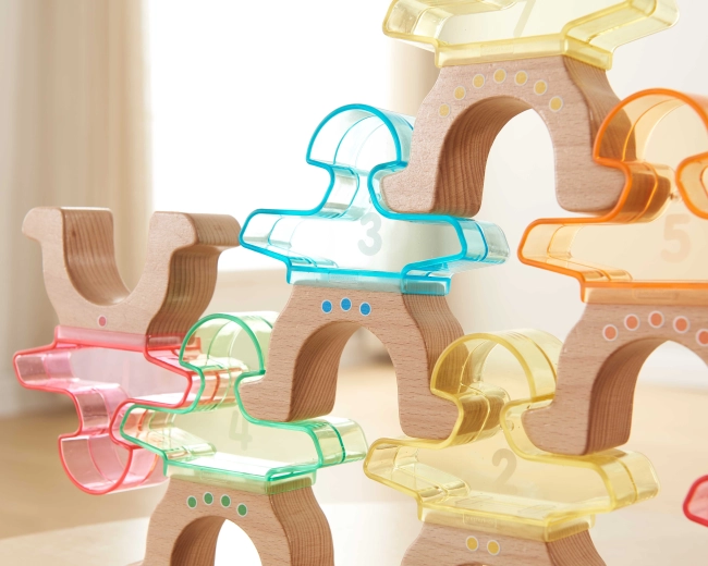 De gennemsigtige farvede elementer i kombination med naturtræ stimulerer fantasien. Figurerne kan stables til pyramider, små tog og originale former.