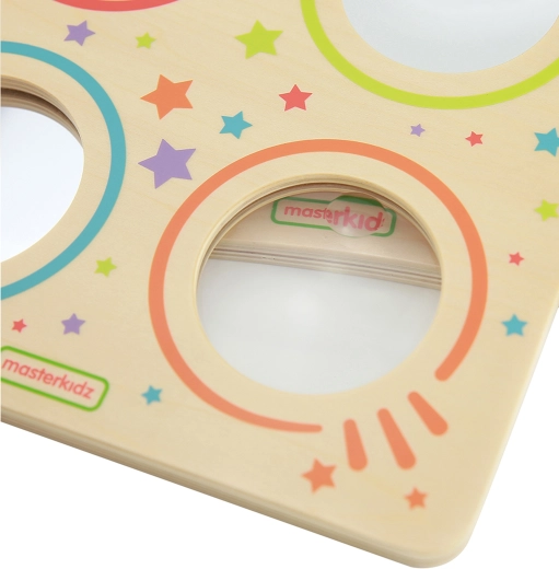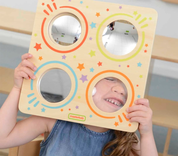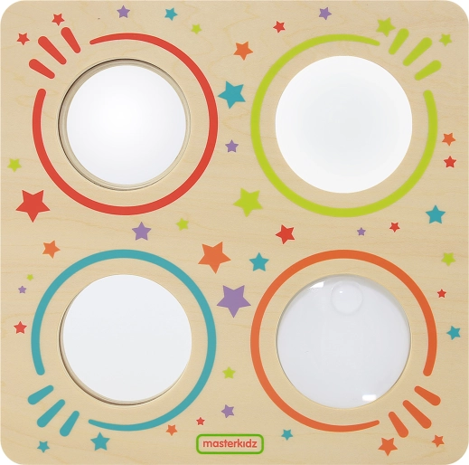 Denne sanse-tavle fra MASTERKIDZ gør det muligt for børn sikkert at undersøge, hvordan billeder ændrer sig i forskellige typer spejle og under en linse. Barnet ser krummede reflekser, forstørrede detaljer og realistiske billeder, hvilket naturligt forklarer grundlæggende principper for lys og optik.