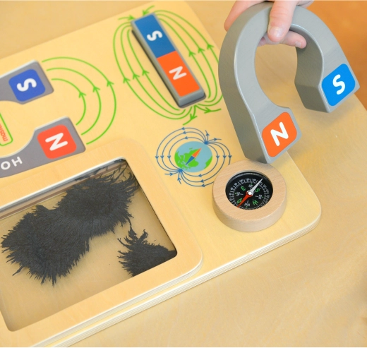 Denne robuste træstavle vækker nysgerrighed og styrker forståelsen for fysikkens grundprincipper. Børn kan eksperimentere med tiltrækning og frastødning mellem magneter, observere feltlinjer i jernspåner og udforske verdenshjørner ved hjælp af kompas. Alt er tydeligt illustreret og sikkert indbygget i panelet, så læringen bliver overskuelig og sjov.