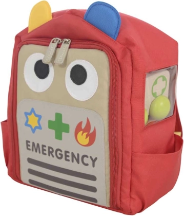 Rygsækken bliver på ingen tid til et komplet redningscenter – børn kan ubesværet skifte mellem rollerne som politibetjent, brandmand og læge.