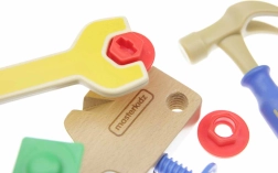 Hammer, nøgle, skruetrækker, skruer og tappe er lavet af kvalitets træ, behagelige at holde om og ideelle til træning af finmotorik.