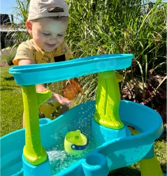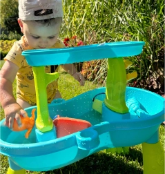 Det indeholder forskellige teksturer og stimulerende elementer, der opmuntrer børn til at opdage vand- og sandverdenen.