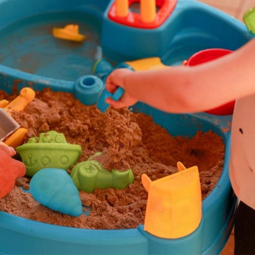 Det rige sæt med 14 tilbehørsdele (forme, vandkande, mølle, skovl, rive, lille bil og 2 både) udvikler fantasi, øje–hånd-koordination og fælles leg for flere børn. Takket være den stabile plastkonstruktion er bordet velegnet til både udendørs og indendørs brug og er let at rengøre.