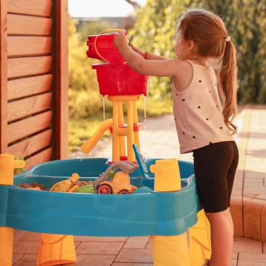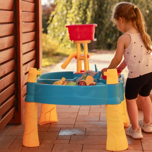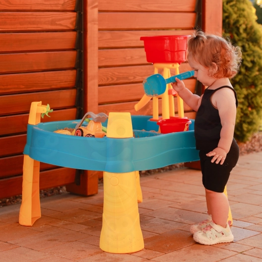 Leder du efter et alsidigt børnebord til leg i haven, på terrassen eller på børneværelset? Dette vand- og sandbord 2-i-1 har separate kamre til vand og sand, så børn kan øse, hælde og strø som på stranden. Vandmøllen drejer, når der hældes vand, og styrker forståelsen af årsag og virkning.