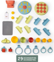 - 29 tilbehørsdele i pakken, f.eks. render, kopper, skovlhjul og bolde, som inspirerer til kreativ leg.