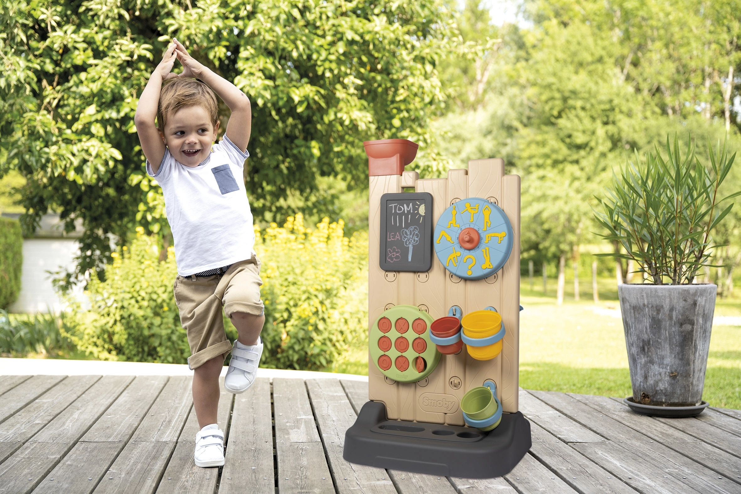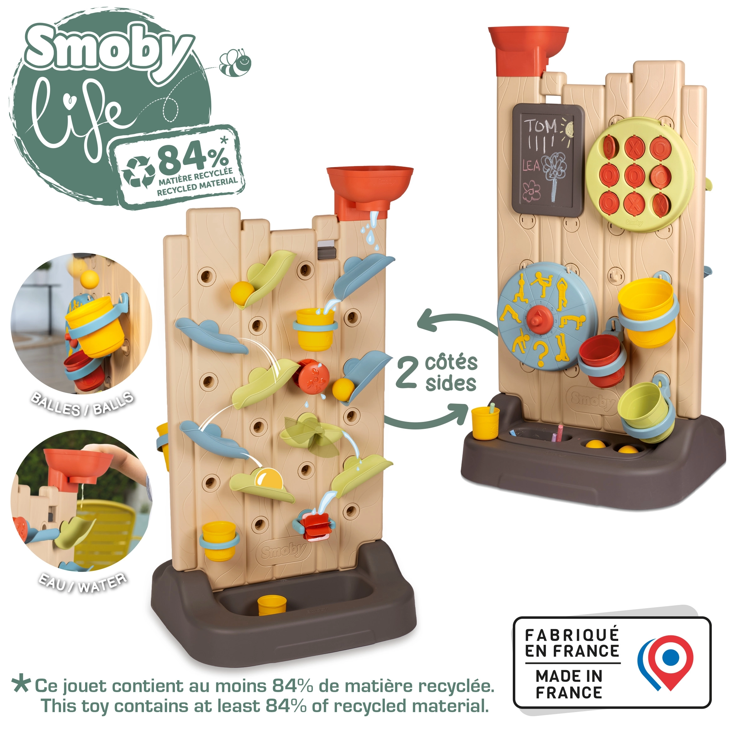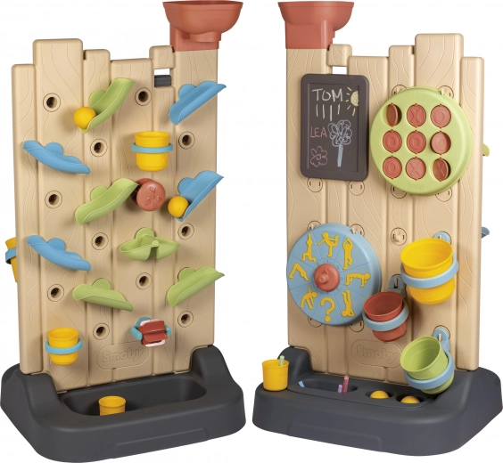 - Indeholder 6 aktiviteter: vandlej, tre på stribe, kridttavle, sports-hjul, boldkast og interaktive elementer til at skabe egne vandbaner.