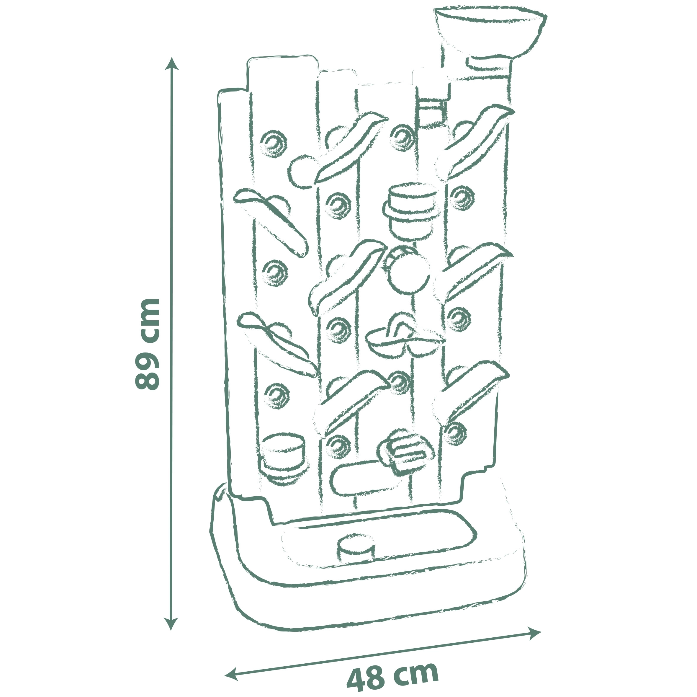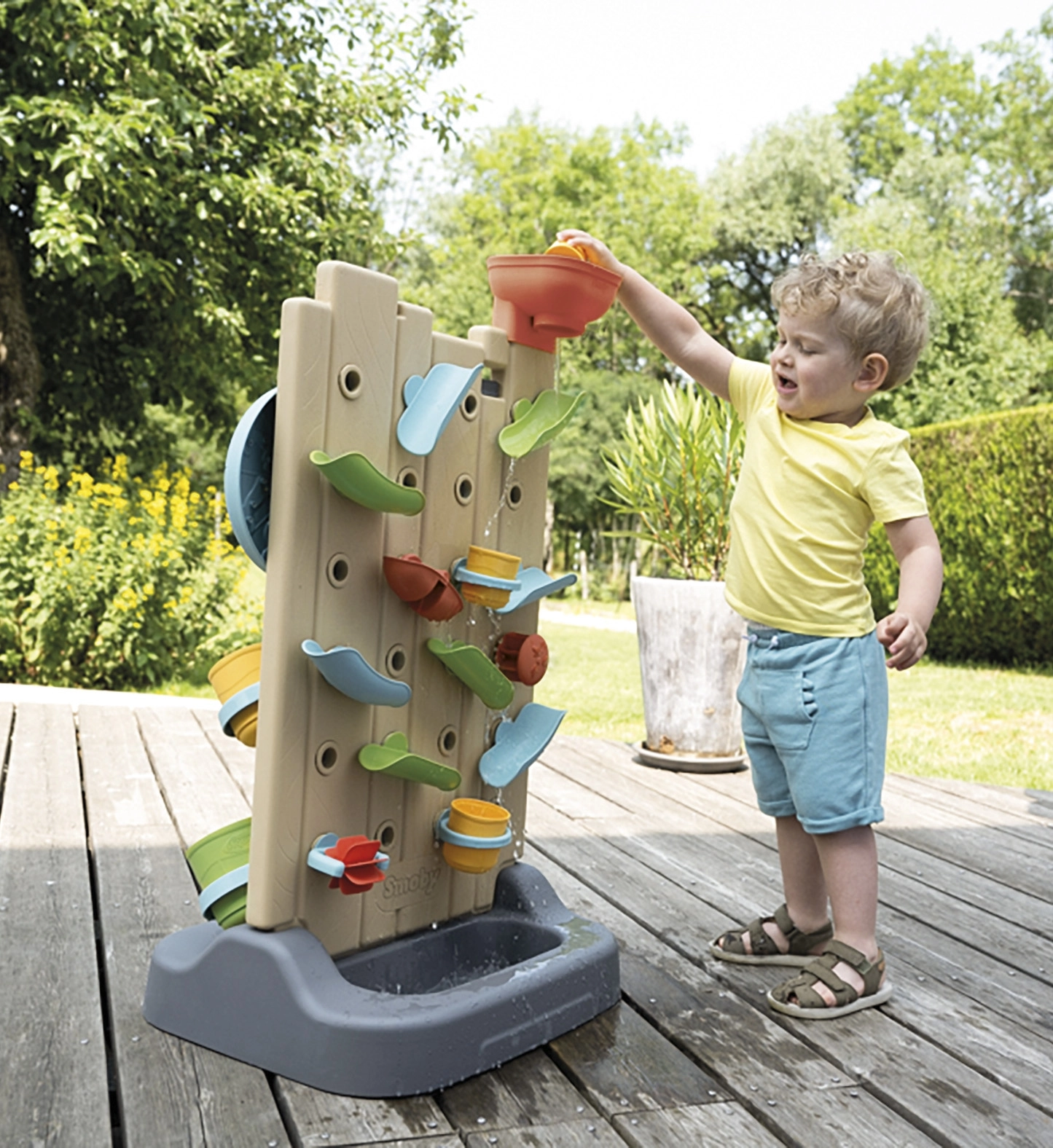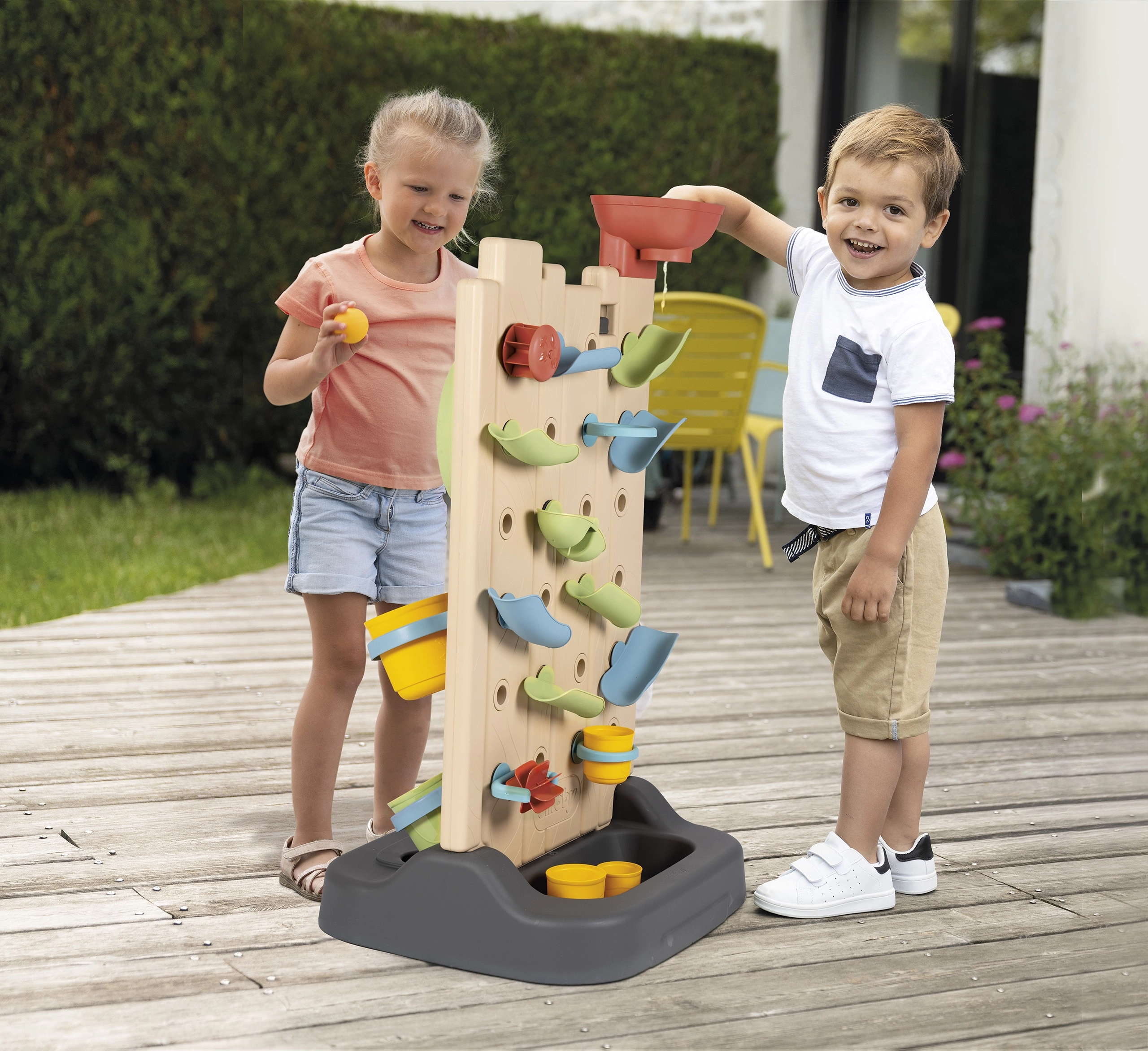 - Indeholder 6 aktiviteter: vandlej, tre på stribe, kridttavle, sports-hjul, boldkast og interaktive elementer til at skabe egne vandbaner.