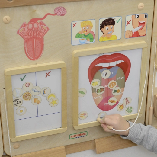 Børn lærer, hvordan de beskytter deres smagssans og holder sig sikre under leg. Tavlen stimulerer fantasi og nysgerrighed.