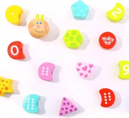 De nummererede klodser og formede brikker trækkes på snoren, og børn øver helt naturligt at tælle, sortere og forstå rækkefølge. Ideel til de første matematiske skridt.