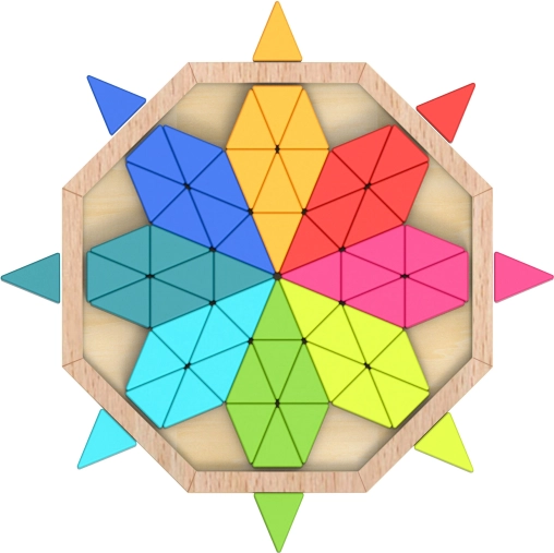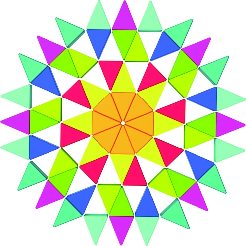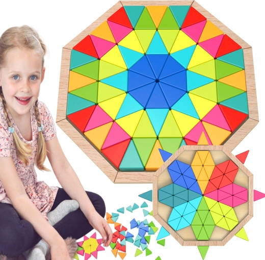 Det store sæt trekanter gør det muligt at lægge både enkle figurer og komplekse mandalaer og mønstre – fantastisk underholdning i timevis.