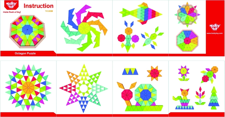 TOOKY TOY træmosaik tilbyder ubegrænsede muligheder for at lægge mønstre af farverige trekanter. Delene kan placeres i den ottekantede ramme eller bruges på enhver plan overflade. Børn træner farve- og formgenkendelse, logisk tænkning og koordinationsevner under legen.