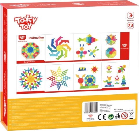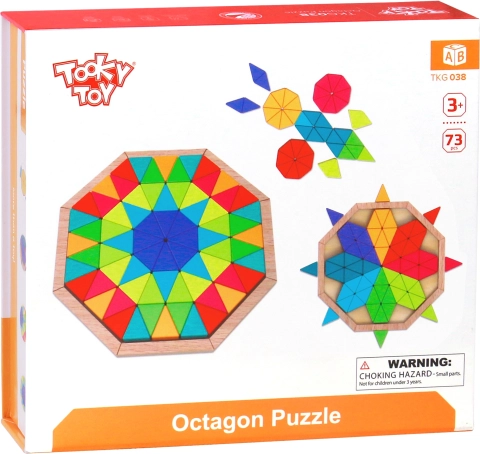 Oplev en kreativ verden med TOOKY TOY træmosaik med 73 brikker. Farvede trekanter i en ottekantet ramme udvikler kreativitet, fantasi og finmotorik. Legetøjet er lavet af kvalitets træ og lakeret med ikke‑giftige farver, så det er sikkert og miljøvenligt.