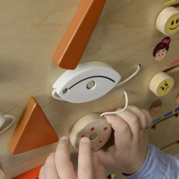 Pladen kan nemt bruges i en ramme på væggen eller stående på bord eller gulv. Den er robust, sikker og ideel til Montessori-tilgang med sanse- og praksisnære aktiviteter.