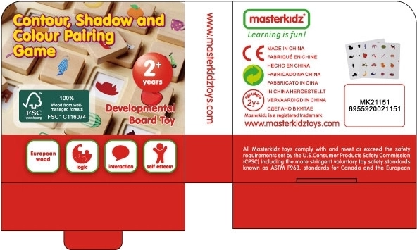 Udskiftelige kort med identiske billeder, farvede silhuetter og sorte skygger muliggør en glidende udvikling af færdigheder fra enkel matchning til mere abstrakt formopfattelse.