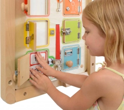 Dette robuste træpanel byder på 6 forskellige låger og låsemekanismer – fra simple lukker til mere avancerede kroge og hasper. Børn øver på legen måde tålmodighed, fingerfærdighed og problemsløsning. Hver åbning af en låge belønnes med plads til at gemme småting eller kort.