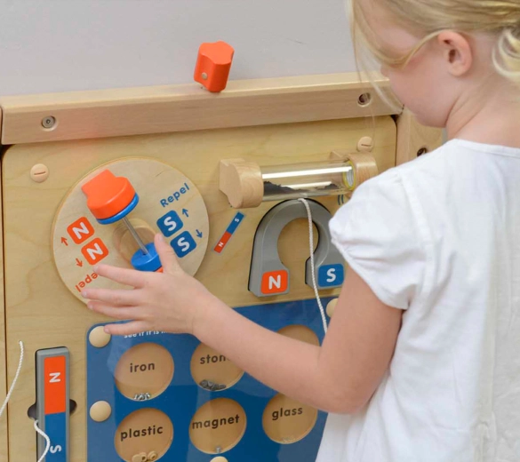 Børn undersøger, hvilke materialer en magnet tiltrækker, og forstår forskellen mellem magnetiske og ikke-magnetiske stoffer – ideelt til de første STEM-færdigheder.