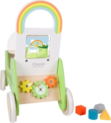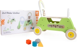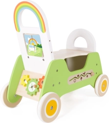 Denne farverige 2‑i‑1 træ-skubbe- og ridevogn kombinerer en stabil gåvogn med et sjovt køretøj i ét. Børn får selvtillid i at lære at gå, skubbe og sidde, mens de samtidig udvikler bevægelseskoordination, balance og kreativ leg. Takket være den høje kvalitet og de glatte, afrundede kanter er den et ideelt valg til de mindste opdagelsesrejsende.