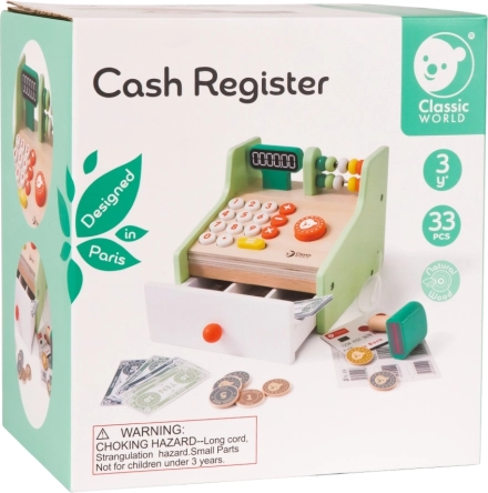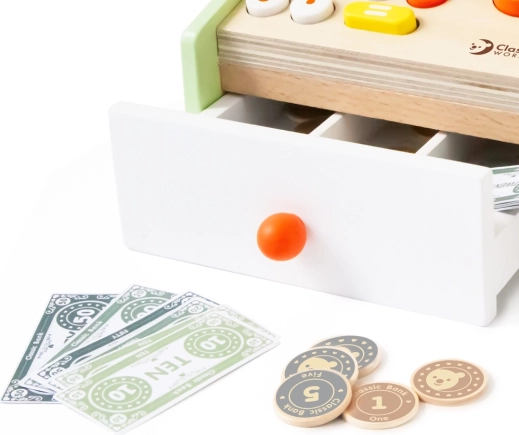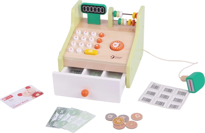 Dette trækasseapparat er den ideelle legeting for små ekspedienter og kunder. Det tilbyder realistiske funktioner som display, knapper, tæller, udtrækkelig pengekasse og scanner, så børn lærer grundlæggende regning, penges værdi og almindelige hverdagssituationer.