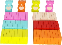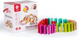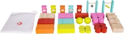 Dette farverige sæt trædomino giver børn underholdning i timevis. Du finder rektangulære brikker, bjørnefigurer, valser, terninger, kugler, porte med klokke og med tværstang samt en tekstilpose. Kombinationen af naturligt træ og seks klare farver inspirerer til fantasi, banebygning og farverige sekvenser.