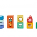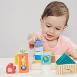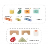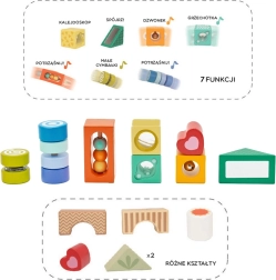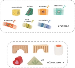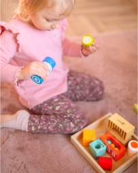 Dette kvalitets-sæt indeholder mange former og elementer til sanseoplevelser – gennemsyn, lyd- og bevægelige detaljer – som naturligt guider børn til at observere, sortere og udforske. Leg med klodserne udvikler logisk tænkning, problemløsning og hånd-øje-koordination.