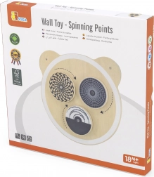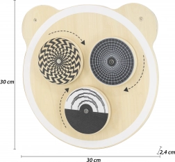 Den træbaserede vægplade med bjørnemotiv er ideel til at udvikle børns logiske tænkning og fantasi. Den indeholder tre runde elementer, som ved rotation skaber optiske illusioner, og den er malet med giftfri farver i livlige nuancer. Dette legetøj vil glæde hvert barn og passer både hjemme og i institutioner.