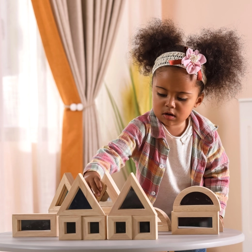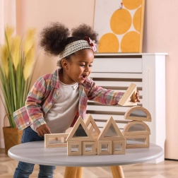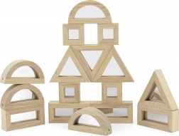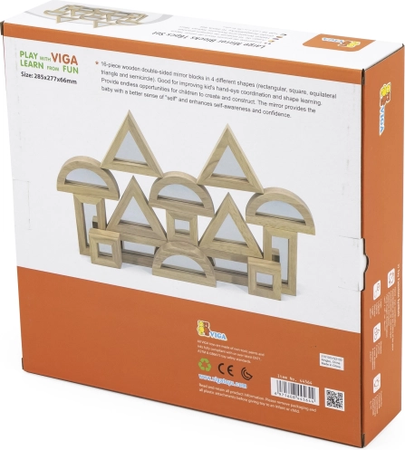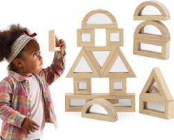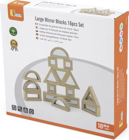 Udvid barnets fantasi med kvalitets træklodser med spejlflader. Sættet indeholder 16 dele i fire former – rektangel, kvadrat, ligesidet trekant og halvcirkel – som er perfekte til at stable og bygge med. Spejleffekten understøtter naturligt selvbevidsthed og sanseoplevelse under legen.