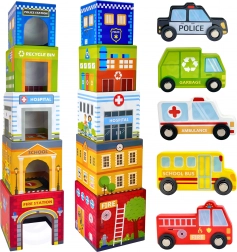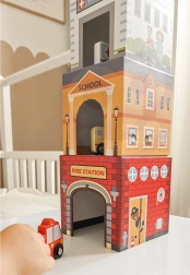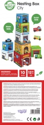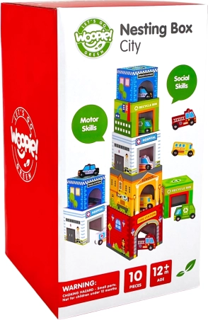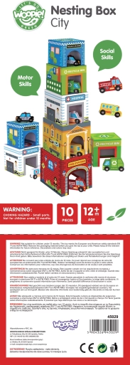WOOPIE GREEN indsætningsby er et kreativt alternativ til klassiske byggesæt. Fem illustrerede kartonklodser forestiller kendte bybygninger (fx brandvæsen, skole, hospital, politi) og er nummereret fra 1 til 5 for nem læring af tælling og størrelser. Særlige åbninger i klodserne gør det muligt at indsætte og opbevare køretøjer, så børn kan skabe deres egne historier og scener fra bylivet.