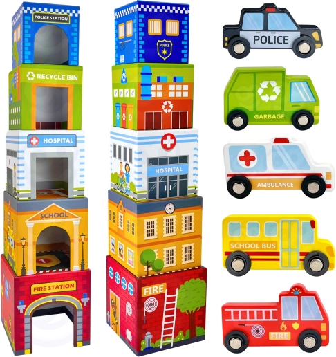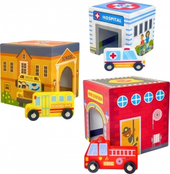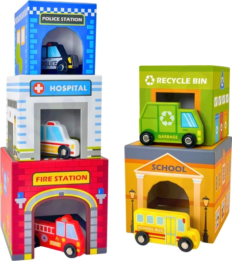 Der medfølger fem søde små trækøretøjer på stille gummihjul (fx brandbil, ambulance, politibil, bus, skraldebil). Legen understøtter kreativitet og fantasi, visuel perception samt hånd‑øje‑koordination. Materialer og farver er sikre og ikke‑toksiske, ideelle til små opdagere fra 12 måneder.