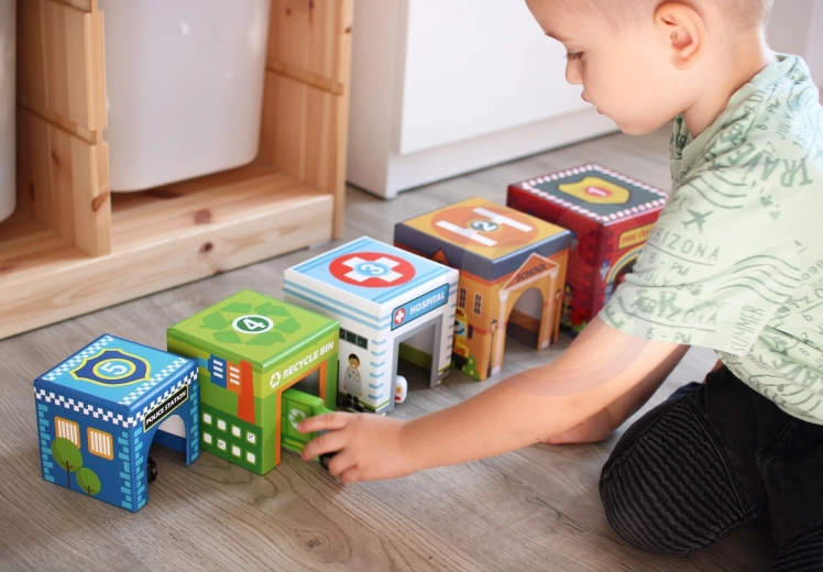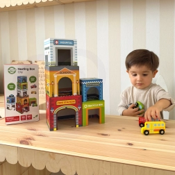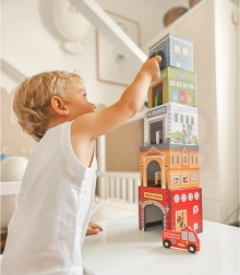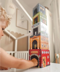 Fem nummererede klodser med åbninger gør det muligt at bygge tårne, indsætte køretøjer og på legende vis udforske byen – ideelt til at udvikle fantasien.