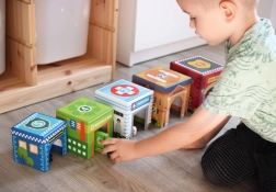 Oplev sjov læring med WOOPIE GREEN indsætningsby – farverige stableklodser med motiver af bybygninger og tal, suppleret med trækøretøjer på gummihjul. Børn fra 12 måneder træner finmotorik, logisk tænkning og kendskab til byens verden ved at bygge tårne, indsætte biler i bygninger og lege historier.
