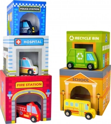 Sættet indeholder 5 robuste små trækøretøjer (fx brandbil, politi, ambulance, skolebus, skraldebil) med stille og jævn kørsel.