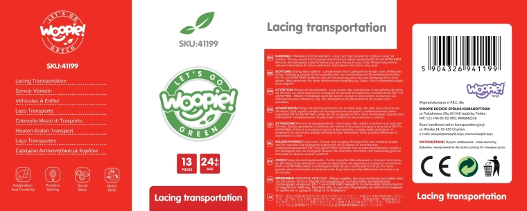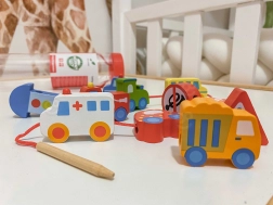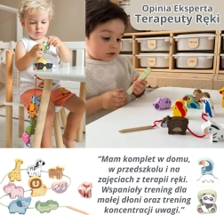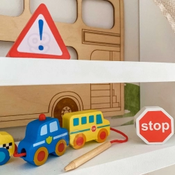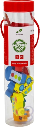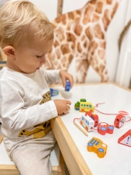 Dette kreative sæt giver børn fra 2 år glæde ved at snore og samle. Med de livlige farver og forskellige former på køretøjer lærer de små hænder præcision og tålmodighed, mens børnene på legende vis tilegner sig grundlæggende trafikkundskab. Naturligt træ og glatte kanter sikrer en behagelig og sikker berøring.