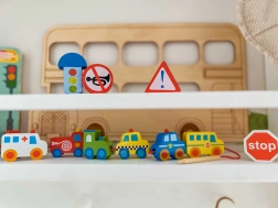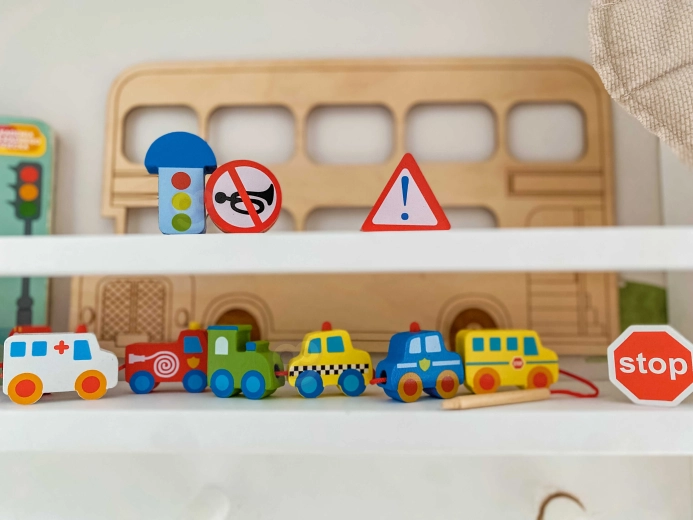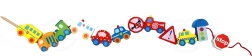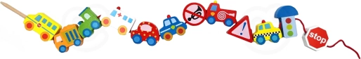 De farverige træbrikker forestiller biler, bus, traktor, ambulance og færdselsskilte – børn bliver på en sjov måde introduceret til trafikkens verden.