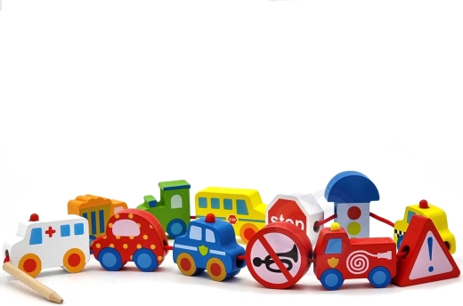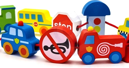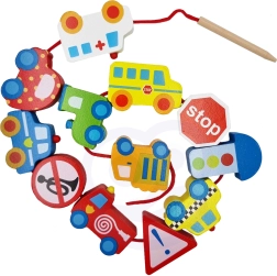 Pakken indeholder 12 træklodser med køretøjsmotiver og 1 snor med en træpind for nem gennemtrådning. Ved at snore brikkerne kan man skabe sine egne “køer” eller historier fra byen – fra brandbil over politibil til bus og færdselsskilte.