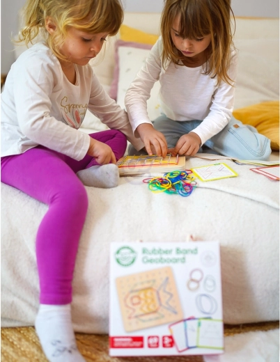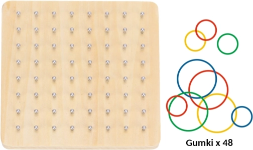 - Rigt sæt: træplade med pinde og 48 farvede elastikker til utallige kombinationer.