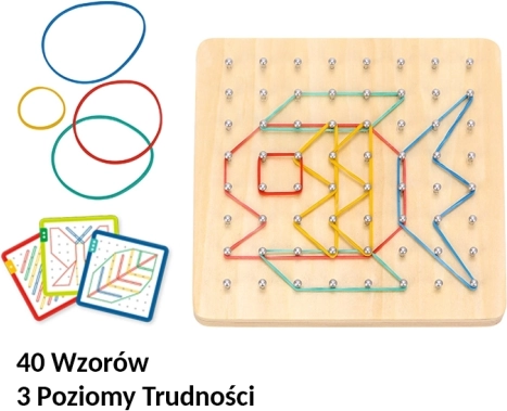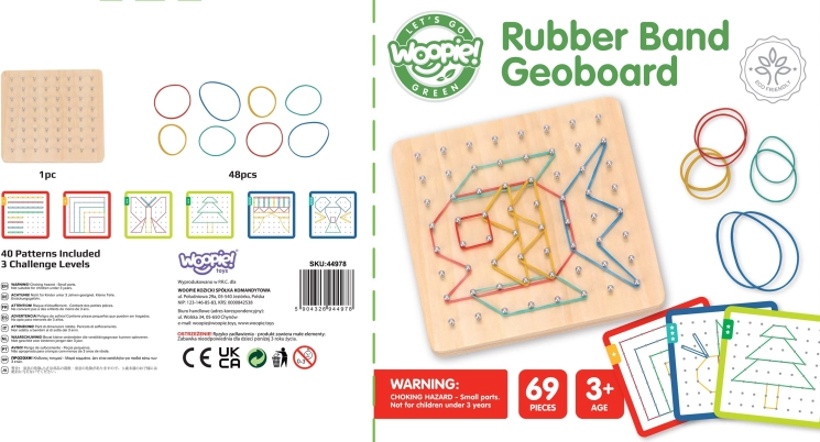 Den træbaserede læringslegetøj geoplan fra WOOPIE i GREEN-serien giver børn fra 3 år uendelige muligheder for at skabe. Farvede elastikker spændes mellem metalpinde på en robust træplade og danner simple eller mere avancerede figurer. Børn kan følge dobbeltsidede mønsterkort eller lave deres egne kompositioner – den ideelle kombination af leg og læring.