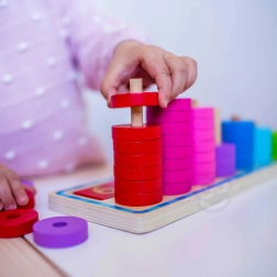 Børn matcher farvede ringe med tal og lærer intuitivt at tælle, genkende farver og forstå begreberne mere–mindre.