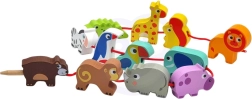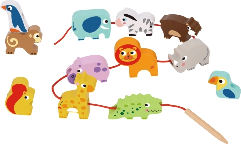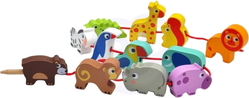 At træ perler med trædyr på snoren styrker fingrene, forbedrer grebet og træner præcision samt koncentration.
